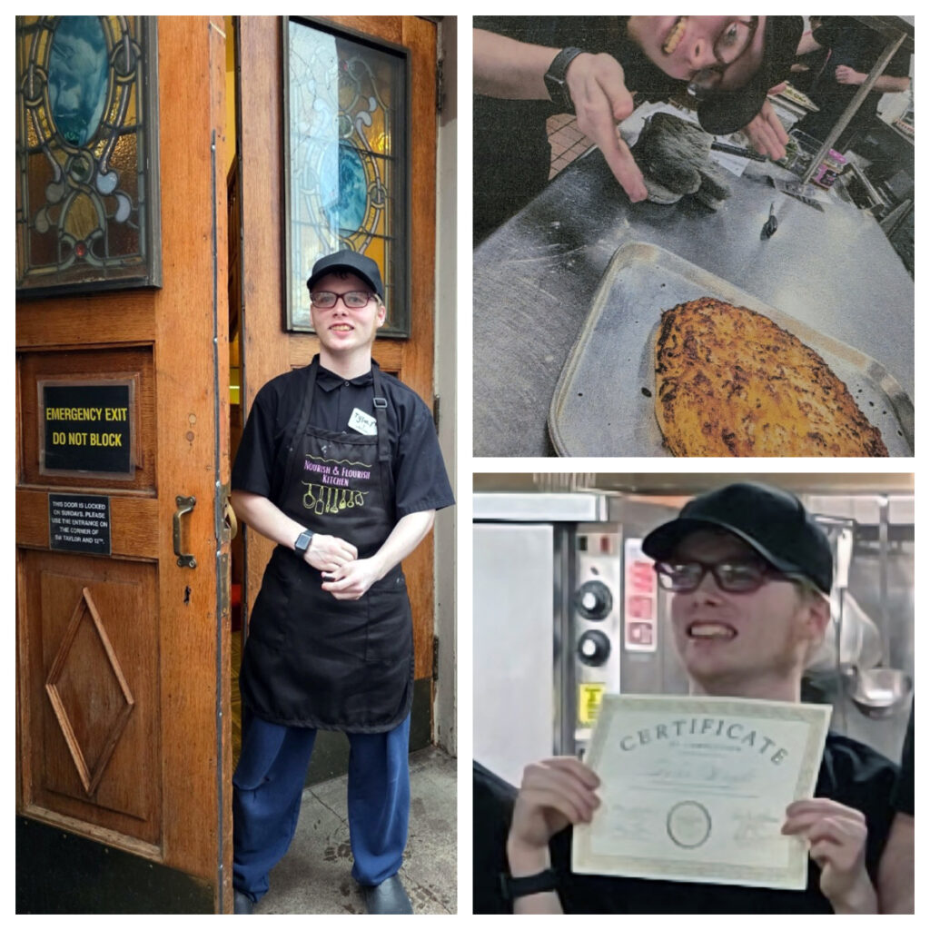 This fall, with support from his Kerr adult group home, Tyler graduated from Nourish & Flourish Kitchen, a 16‑week culinary training program through Germaine’s Culinary Inc. The program empowers people with intellectual and developmental disabilities (I/DD) to build confidence and practical skills through hands‑on learning alongside professional chefs.