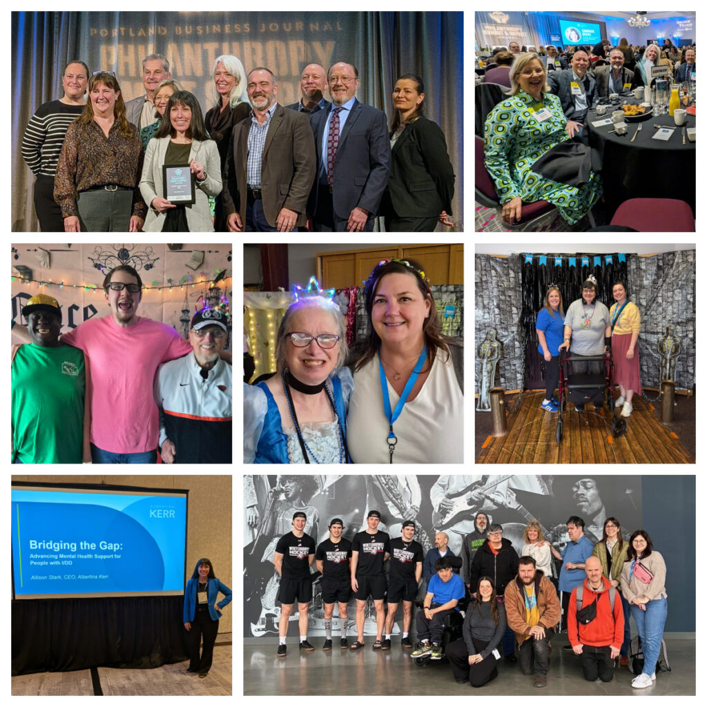 Third row (left to right): Kerr CEO Allison Stark presenting at ANCOR Connect ’26; Kerr’s Beaverton Inclusive Day Services program with the Portland Winterhawks